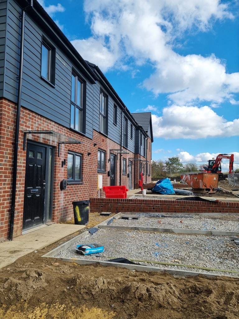It looks a little different now. The new houses are shiny and modern-looking, with red brick wrapped around the ground floors, panel-clad first floors, large feature windows, and accentuated doorways. They’re built to high energy efficiency standards with solar panels, car chargers, and a level of insulation that will feel alien to anyone used to living in a draughty Airey prefab.